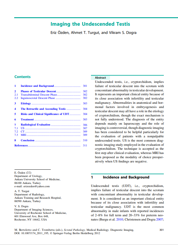 1. Özden E, Turgut AT, Dogra VS. Imaging of the undescended testis. Pgs;301-311 in, eds:Bertolotto M, Trombetta C. Scrotal Pathology, Medical Radiology, Diagnostic Imaging. Berlin, Springer-Verlag. 2012